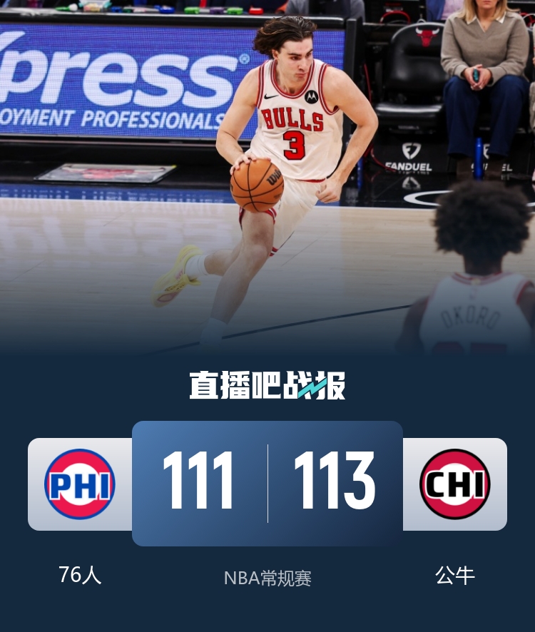 首节对决76人反客为主外线手感热到发烫,他们单节三分11投8中,单节25投16中爆砍45分并在首节就拿到18分优势;次节双方虽然状态相差不大但首节巨大的分差让76人完全控制局面,半场马克西和恩比德合砍40分并帮助76人取得19分领先。休息归来76人攻势回落三分手感骤降,他们前10分钟里仅得16分,公牛追回8分一度缩小至个位数,看到希望后的公牛在第四节一直紧咬比分,76人最后4分钟里一分未得拱手让出主动权,武切维奇最后时刻命中三分完成准绝杀。最终,公牛主场最多落后24分的情况下完成翻盘逆转76人夺得榜首大战的胜利。