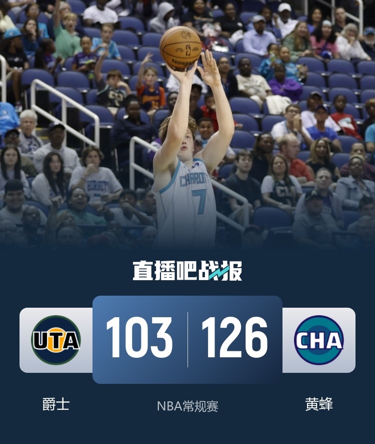 比赛开场,两队很快找到进攻状态,展开对攻战,比分交替领先,但下半节爵士突然断电,黄蜂抓住机会建立两位数领先优势。次节黄蜂延续外线的火热手感,很快将分差扩大到20分以上,爵士这边则由马尔卡宁苦苦支撑,半场结束黄蜂71-48领先。易边再战,爵士进攻端手感回暖,但黄蜂依然牢牢掌握场上主动,分差在20分上下波动,比赛进入末节,黄蜂稳扎稳打维持分差,比赛结果盖棺论定,最终黄蜂126-103大胜爵士。